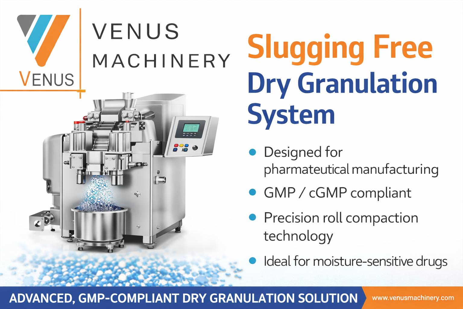 VENUS MACHINERY, Ahmedabad, with over 22 years of experience in pharmaceutical machinery manufacturing, offers precision-engineered slugging-free dry granulation systems designed in compliance with Schedule / GMP / cGMP norms. Our systems ensure uniform granule formation, improved productivity, and reliable performance for pharmaceutical manufacturers worldwide.